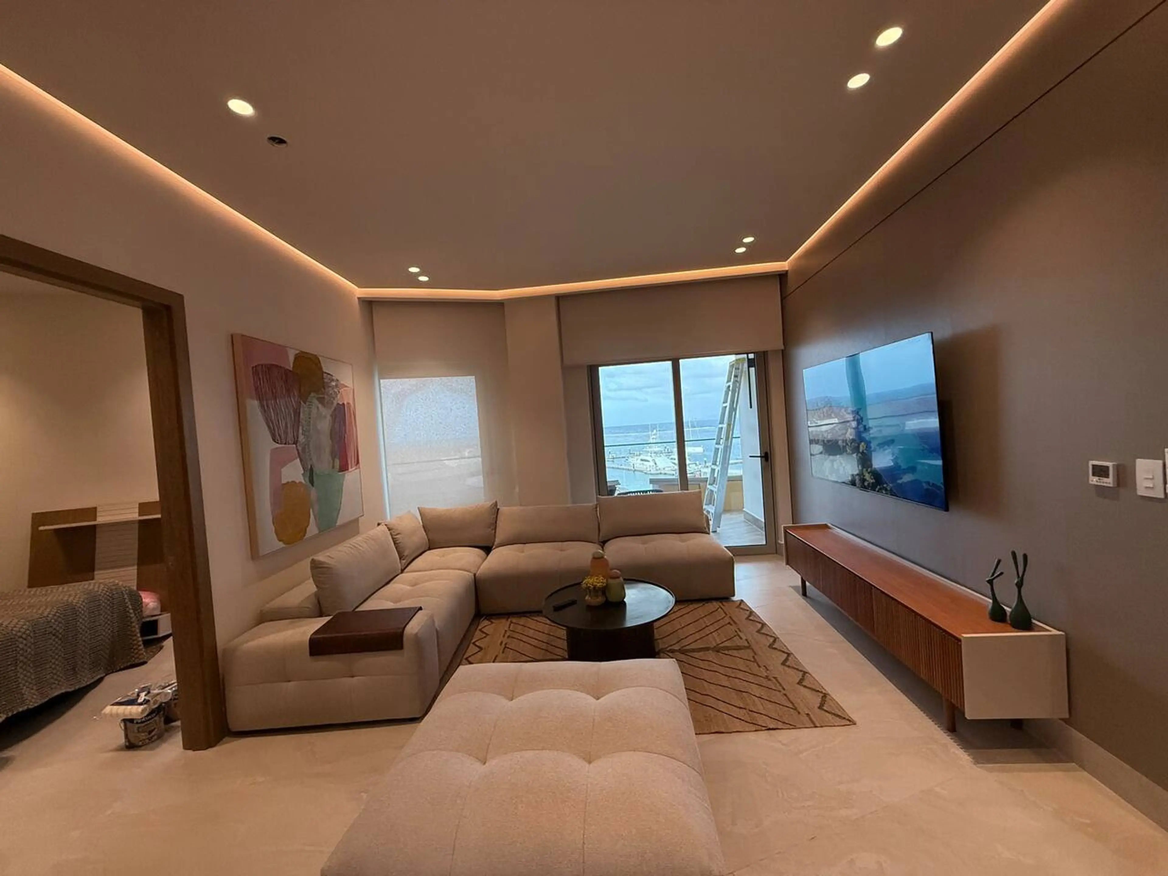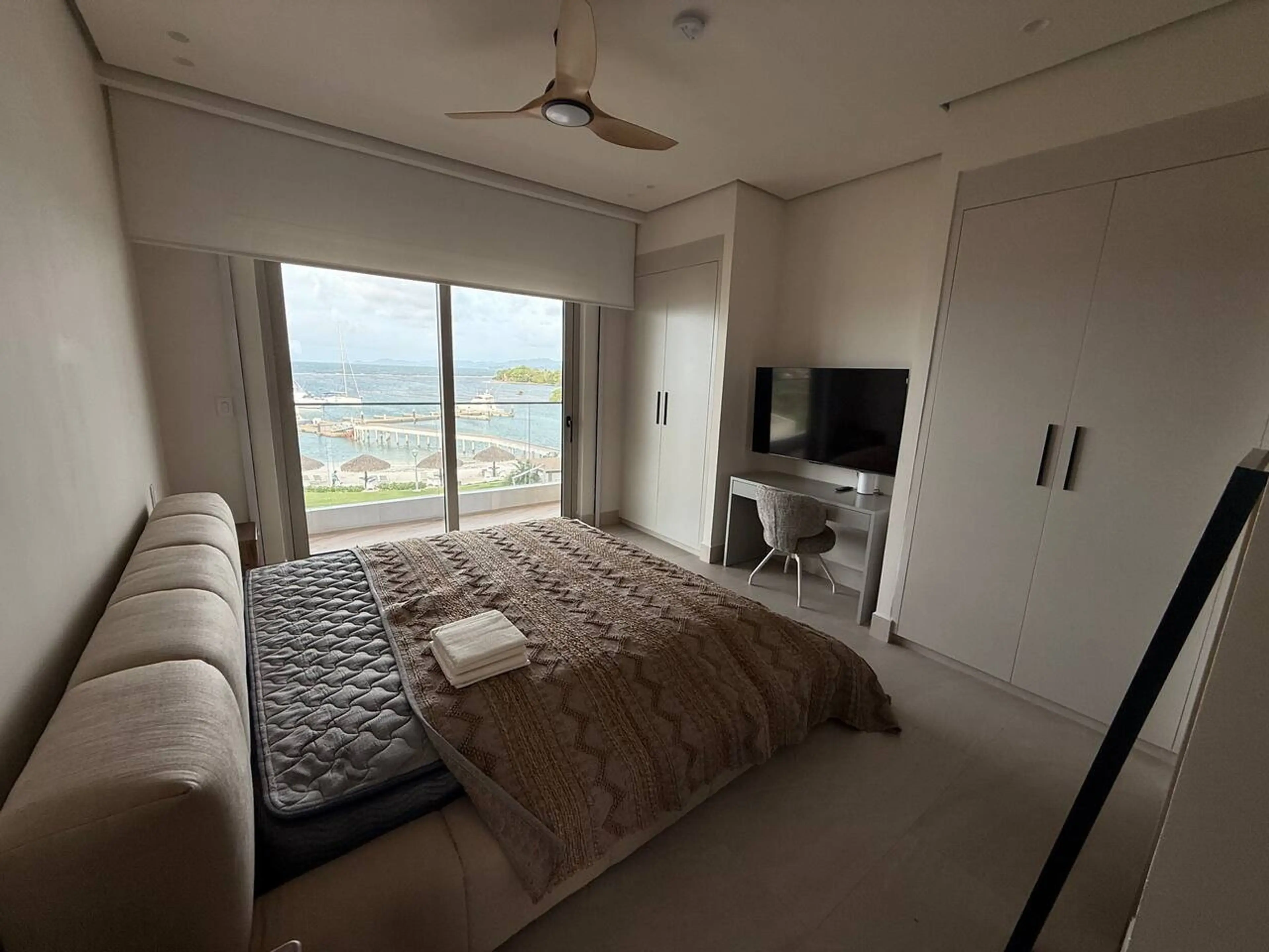 escondidapanama • Modern 3BR/3BA condo with ocean + marina views and a dine-out entertainment patio - 306B Marina Village • Fully equipped kitchen and elegant living room with large smart TV and ambient LED lighting • BR1: King bed, 55" TV, en-suite bath, custom headboard and warm wood finishes • BR...